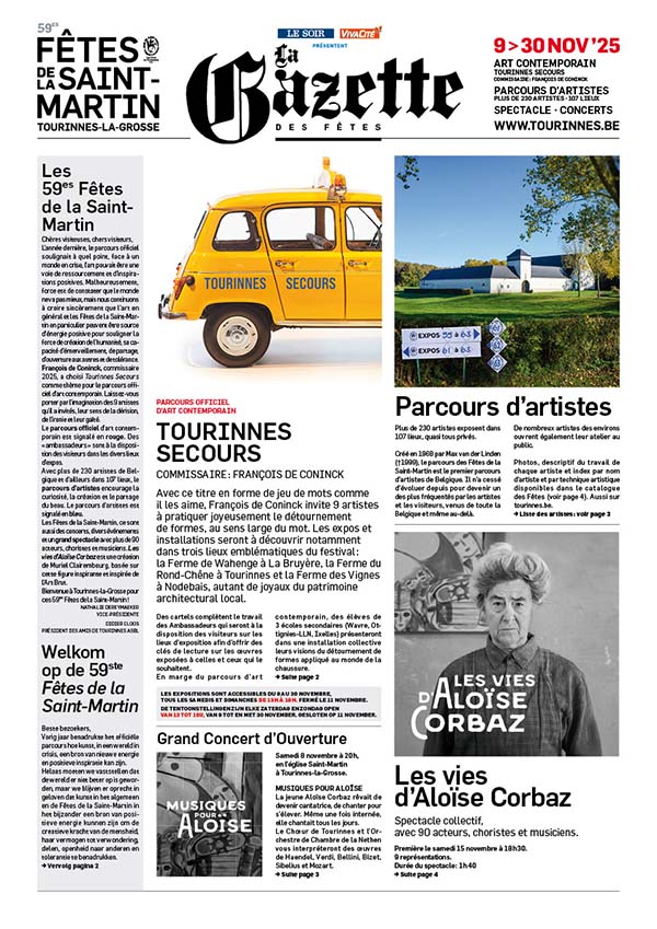 Depuis 1965, chaque mois de novembre, les habitants de Tourinnes-la-Grosse et environs ouvrent leur maison, leur grange, leur atelier… pour accueillir des artistes, et « partager le beau » avec des milliers de visiteurs. Au-delà des expositions, les Fêtes de la Saint-Martin ce sont aussi des concerts et un grand spectacle. 59 ans de rencontres, d’échanges et de convivialité !