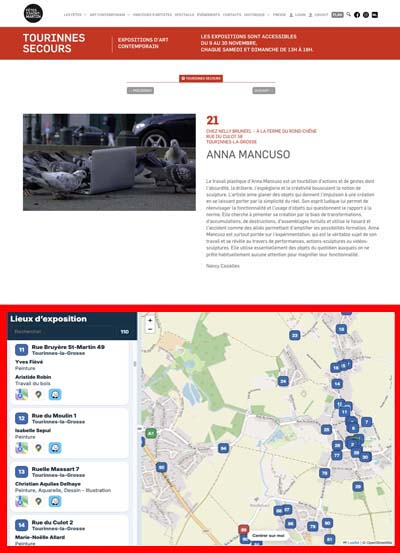 Le plan est interactif, il suffit de cliquer sur le numéro d’exposition qui vous intéresse. Une fenêtre apparaît, mentionnant l’adresse du lieu et les artistes présents à cette adresse. En cliquant sur une des icônes correspondantes (Apple Plans, Google Maps ou Waze), l’itinéraire est créé automatiquement à partir du lieu où vous trouvez, quel qu’il soit.