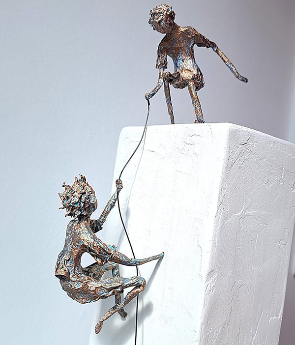 Mixed media die papier, ijzerdraad en terracotta combineren. Door voor papierstroken met lijm te kiezen ontstaan gedetailleerde, lichte figuurtjes; een acrylpatina rondt een trompe-l’œil bronseffect af. Vaak luchtig spelen deze kleine beelden met het licht en werpen ze een schaduw met een vleugje magie.