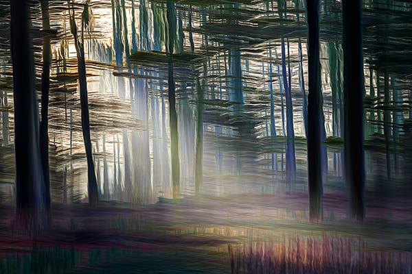 Dans met de bomen Van het zichtbare naar het denkbeeldige orkestreer ik met mijn camera een fijn ballet van schaduwen en bladerdek, waar licht pigment wordt. Mijn aanpak is intuïtief en zintuiglijk, geleid door twee tegelijk toegepaste opnametechnieken: intentionele camerabeweging (ICM) en meervoudige belichting. Lange belichtingen uit de hand nodigen de toeschouwer uit om de dans te betreden.