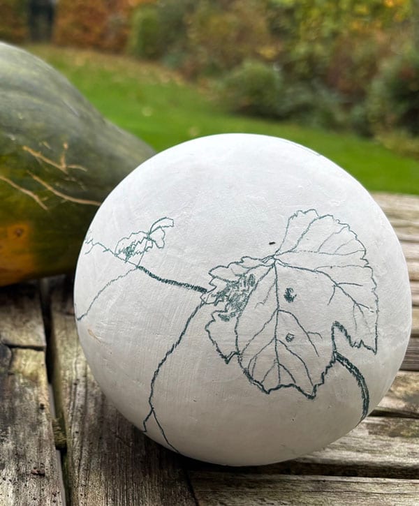 Murielle tekent ze met een oxydepotlood of graveert ze op holle terracotta sferen, te plaatsen in de tuin of als interieurdecoratie.