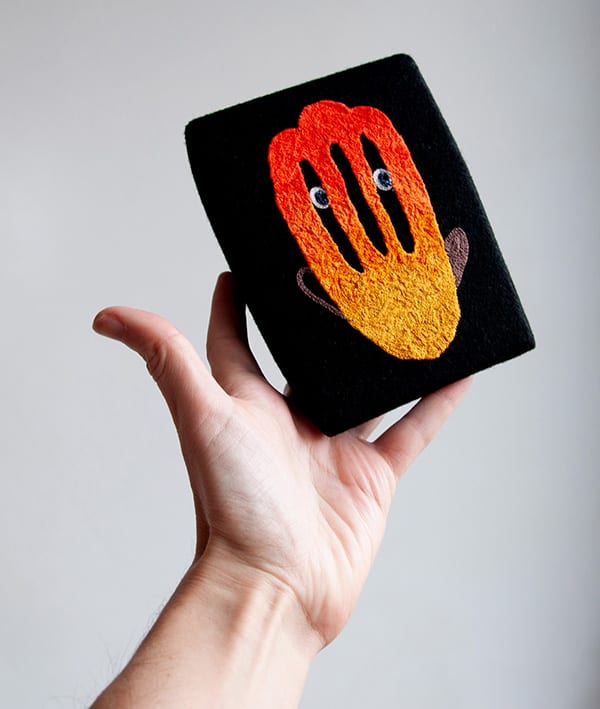 Zijn borduursels, met de hand gemaakt op vilt, bekleden een vooraf gesculpteerd houten stuk.